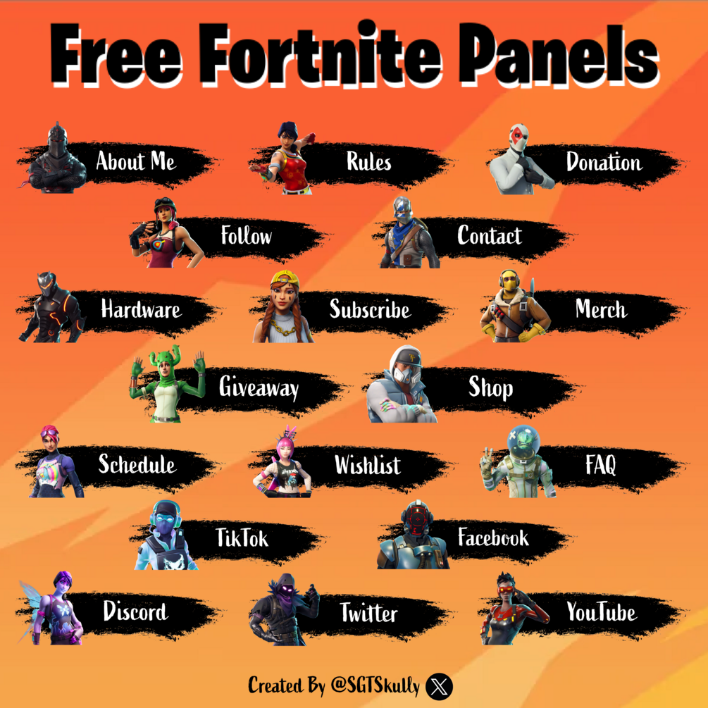 FREE Fortnite Panels$0+$0+https://schema.org/InStockusdSGT SkullySGT SkullyThese panels are free for you to use.Make sure you're following me on Twitter to know when more items are released.Twitter, Twitch, Kick, YouTubeName a fair price:$I want this!Size7.63 MBAdd to wishlist New wishlistShare on XShare on Facebook Copy linkCopy product URL